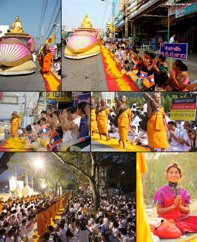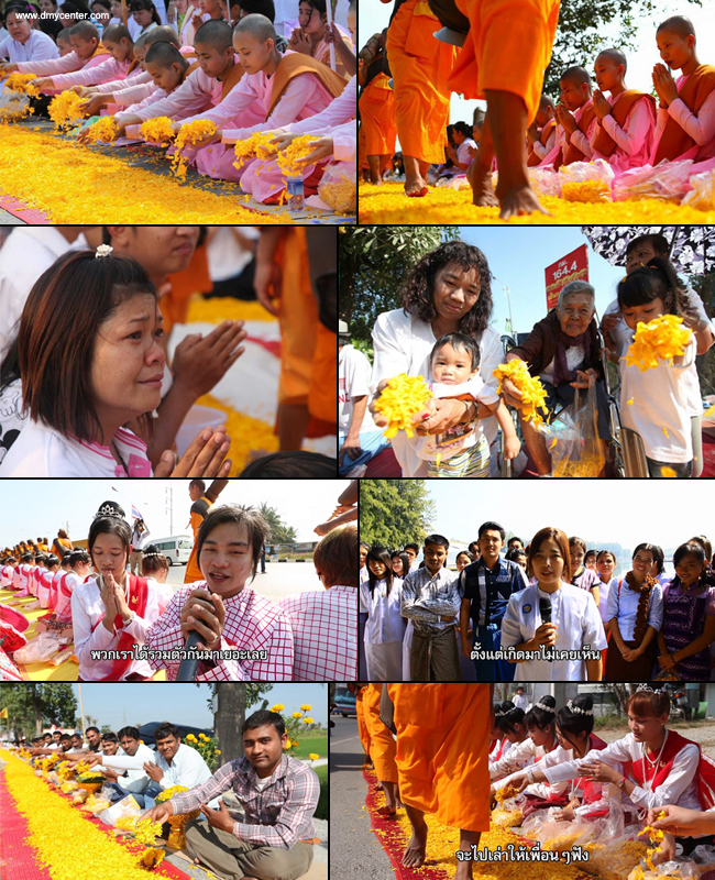 ส่วนอีกกลุ่มหนึ่งเป็นชาวมอญชายและหญิงจากประเทศพม่า ที่ทำงานอยู่ในเขตอำเภอมหาชัย จังหวัดสมุทรสาคร พร้อมใจกันสวมใส่ชุดประจำชาติมอญสีแดง นั่งโปรยกลีบดอกดาวเรืองอย่างเป็นระเบียบเรียบร้อย โดยชาวมอญกลุ่มนี้ กล่าวถึงความรู้สึกในครั้งนี้ว่า “...ดีใจมากที่ได้มาเจอพระเยอะๆ รู้สึกดีใจจนบอกไม่ถูก ที่พม่าไม่เคยเจอพระเยอะๆแบบนี้ เจอที่นี่ครั้งแรกรู้สึกดีใจมาก พวกเราได้รวมตัวกันมาเยอะเลย ดีใจที่ได้ทำบุญวันนี้ วันหลังจะมาอีก อยากทำบุญเยอะๆ มาวันนี้ได้ทำบุญ จะไปเล่าให้เพื่อนๆฟัง อยากให้คนอื่นได้เจอแบบนี้บ้าง...”